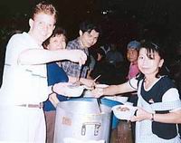 Performing at Christmas 2000. 1).Mary Hart & Angela & friends. 2) Florence, John-Paul & Aichan during show at Fukuinryo children’s institution, Setagaya, Tokyo. We gave each of the 40 orphans stationary & toys & shared a meal contributed by Domino Pizza. In February 2001 we donated computers to the orphanage. 3) Feeding the homeless at Shinjuku Chuo koen. 4) Assisting the disabled from Daishi sagyojyo in Kawasaki on their trip to Atami. |