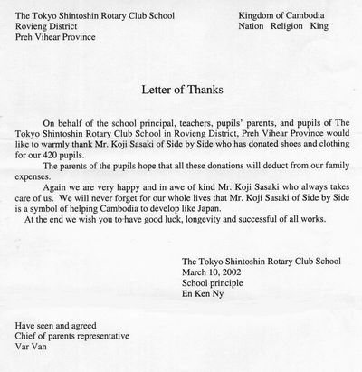 THANK YOU LETTERS FOR DONATIONS TO CHILDREN IN CAMBODIA